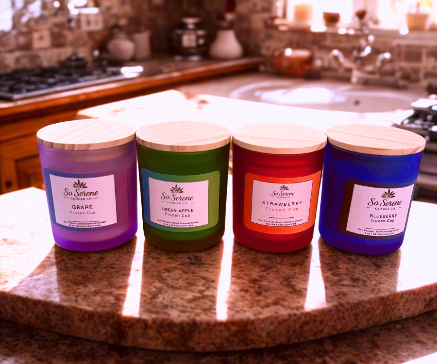 Frozen Cup Candle Collection with strawberry, grape, blueberry, and green apple scented candles